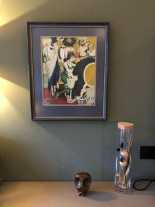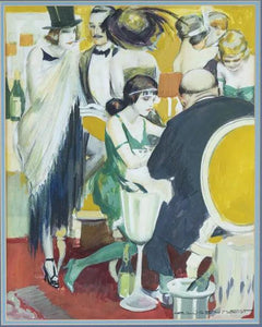 Deze prachtige gouache verbeeldt een roaring twenties cocktailparty. De sfeer is levendig, met mensen gekleed in flapper-stijl jurken en keurige pakken, cocktails drinkend en gezellig. De lucht is gevuld met de geluiden van jazzmuziek en het gerinkel van glazen, terwijl mensen dansen, lachen en converseren.