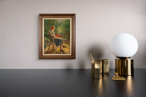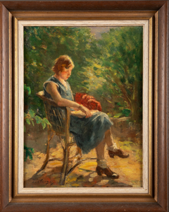 In het schilderij is een sereen en intiem moment te zien van een jonge vrouw die in haar boek verdiept is, zittend in een rotanstoel. Ze draagt een blauwe jurk met soepele plooien, die haar ontspannen houding benadrukken. Op de leuning van de stoel hangt een rood vest dat levendig afsteekt tegen het blauw van haar jurk en warmte toevoegt aan de scène. Haar gezicht is zacht verlicht door het zonlicht.