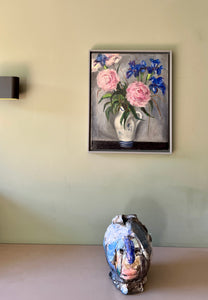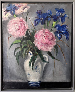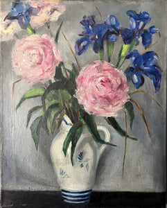 In een vaas zien we pioenrozen, met zachte bloemblaadjes die in elkaar lijken te vloeien. De roze kleur is zeer intens en wordt prachtig afgewisseld met sierlijke irissen, die op hun beurt een mooi contrast vormen met de roze bloemen. De irissen staan ​​rechtop en hun bloembladen hebben een diep blauw-paarse kleur.