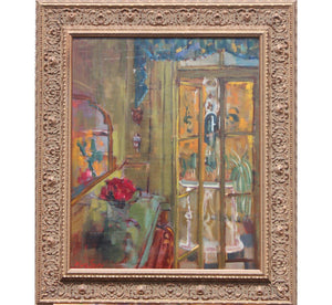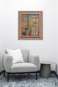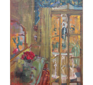At the left side of the composition stands an antique wooden cupboard. A large mirror with wooden frame reflects the room's beauty, adding depth and luminosity to the painting.On top of the cupboard, a striking bouquet of vibrant red flowers in a crystal vase graces the scene, contrasting with the warm, aged wood of the furniture. The flowers exude a sense of vitality against the backdrop of the timeless interior.The focal point of the room is the set of balcony doors made of glass. One of the doors is open, inviting the outside world to merge with the interior space. Sunlight streams through the open door, casting a soft, diffused glow across the room.